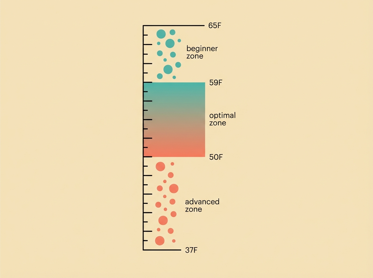 After a month of consistent practice, temperatures below 55F become accessible. Advanced users tolerate 37-45F (3-7C), though this isn't necessary for most benefits. At 45F, 1-2 minutes delivers significant response.