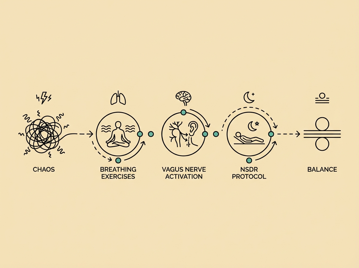 The fastest intervention. Extending your exhale longer than your inhale (try 4 seconds in, 6-8 seconds out) directly activates your vagus nerve, which is the primary parasympathetic pathway. You'll feel a measurable shift in 60-90 seconds.
