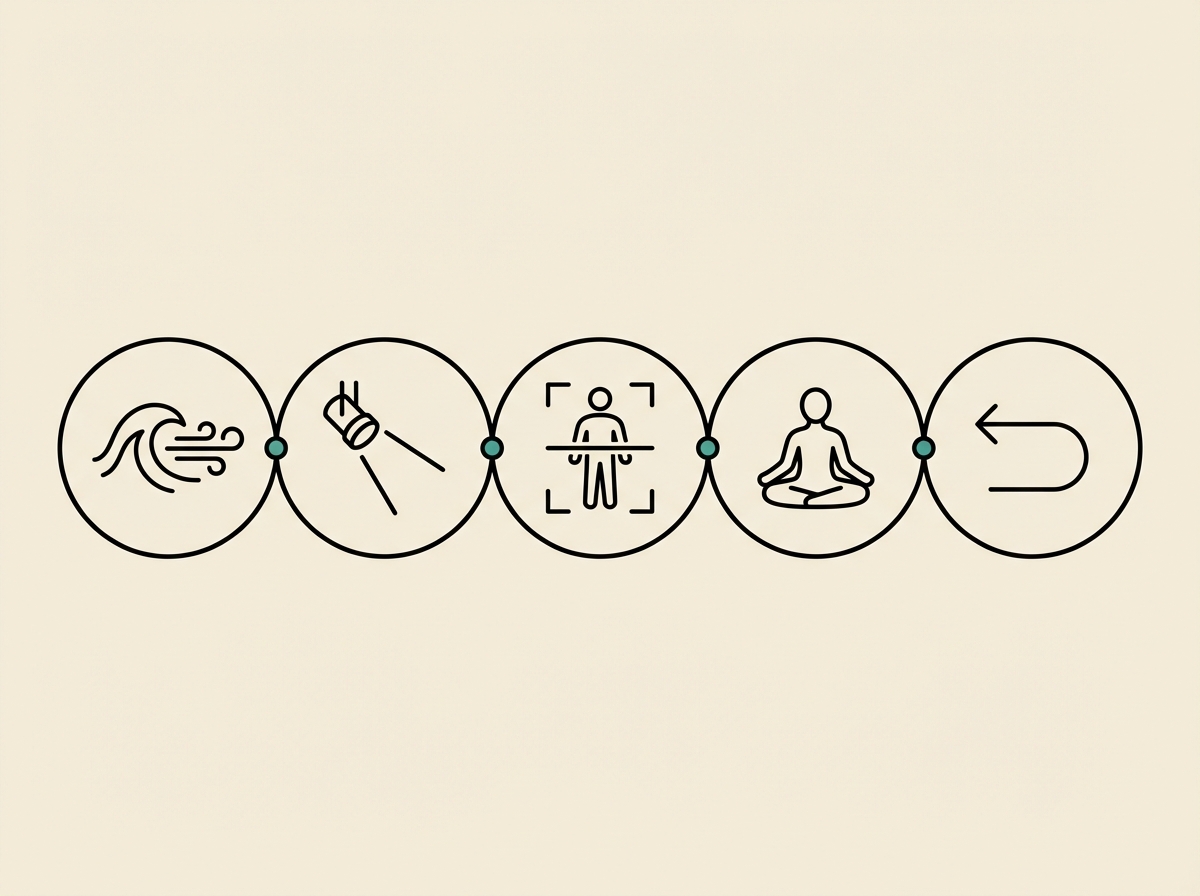- The 5 steps: breath calibration, spotlight dimming, body scan, stillness, gradual return