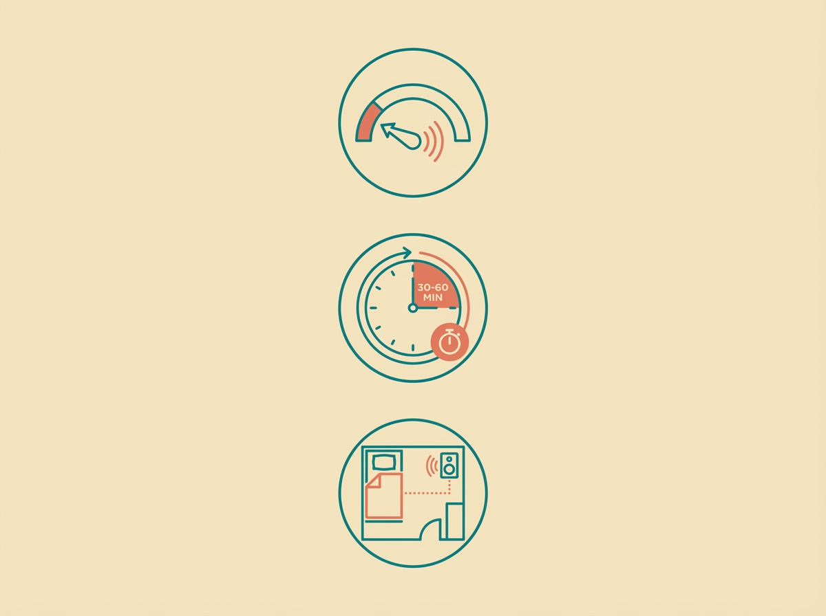 Place the sound machine across the room, not on your nightstand. Distance naturally reduces the volume at your ears and provides more even sound distribution. Under-pillow speakers and earbuds put sound directly into your ear canal, which raises the effective volume significantly.